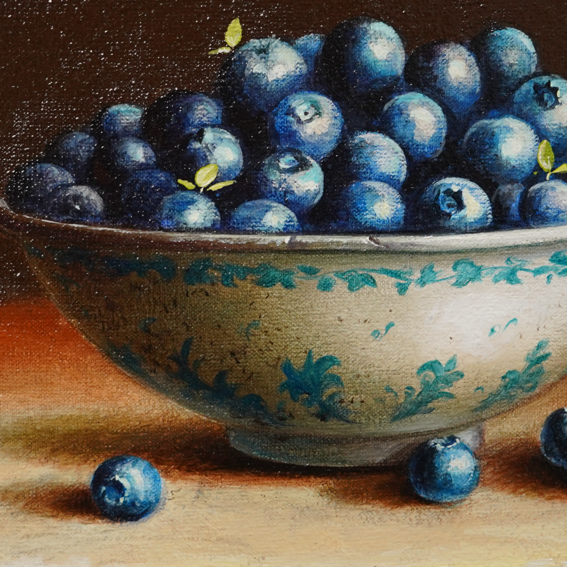 Hand-painted in oil on fine-grain canvas, this classic berry still life captures the natural beauty and play of color, light, and form. Rich texture and visible brushwork are sealed with a glossy varnish for lasting vibrancy, making it a thoughtful gift and a charming accent for kitchen or dining room decor.