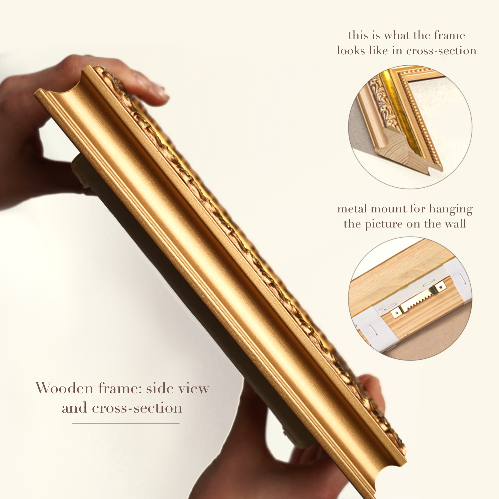Frames: High-quality handcrafted pine wood with a durable gold finish, available in minimalist or vintage style.