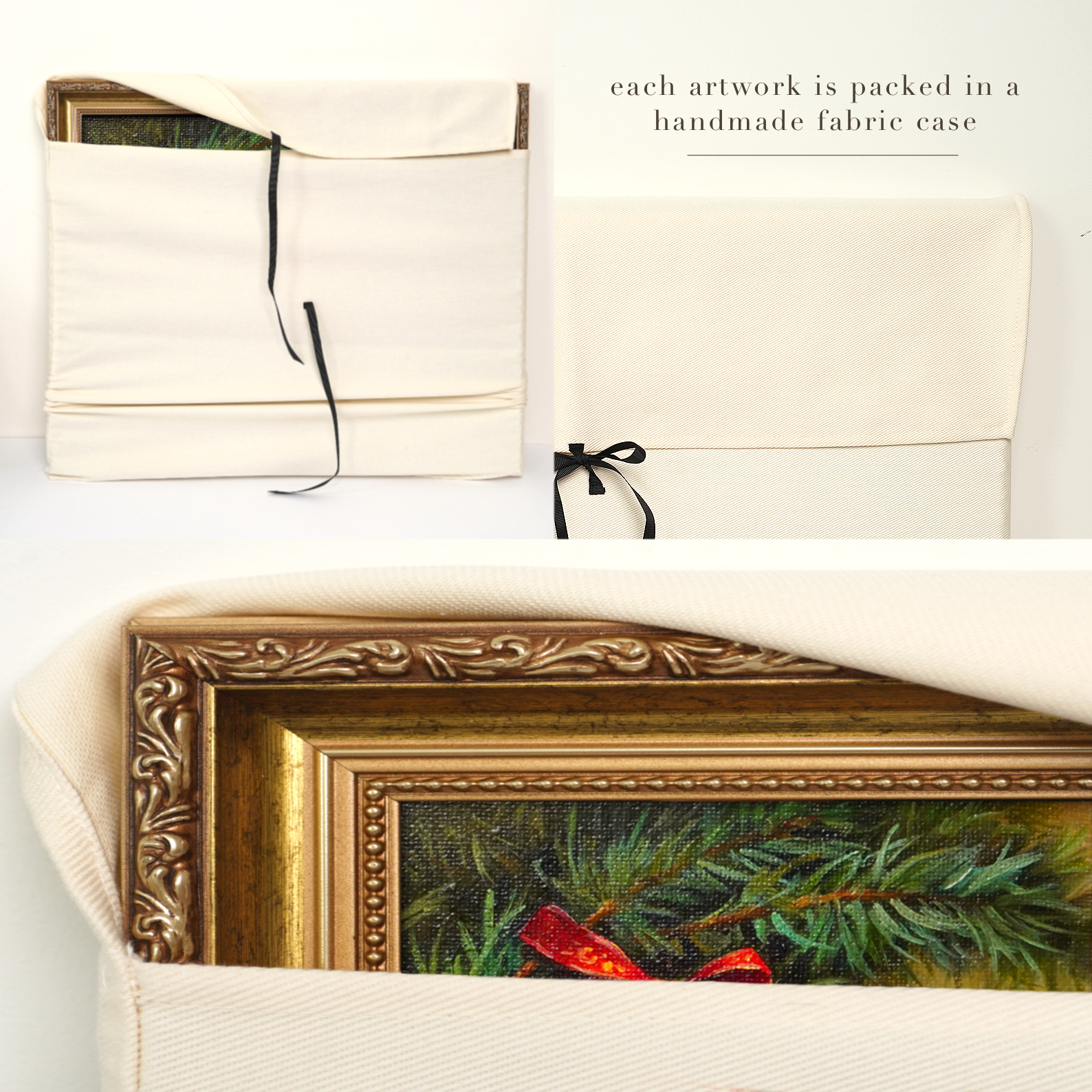 Hand-painted in oil on fine-grain canvas, this festive still life captures the cozy charm and gentle glow of the Christmas season. Rich texture and visible brushwork are sealed with a glossy varnish for lasting vibrancy, making it a thoughtful holiday gift and a charming accent for winter home decor.