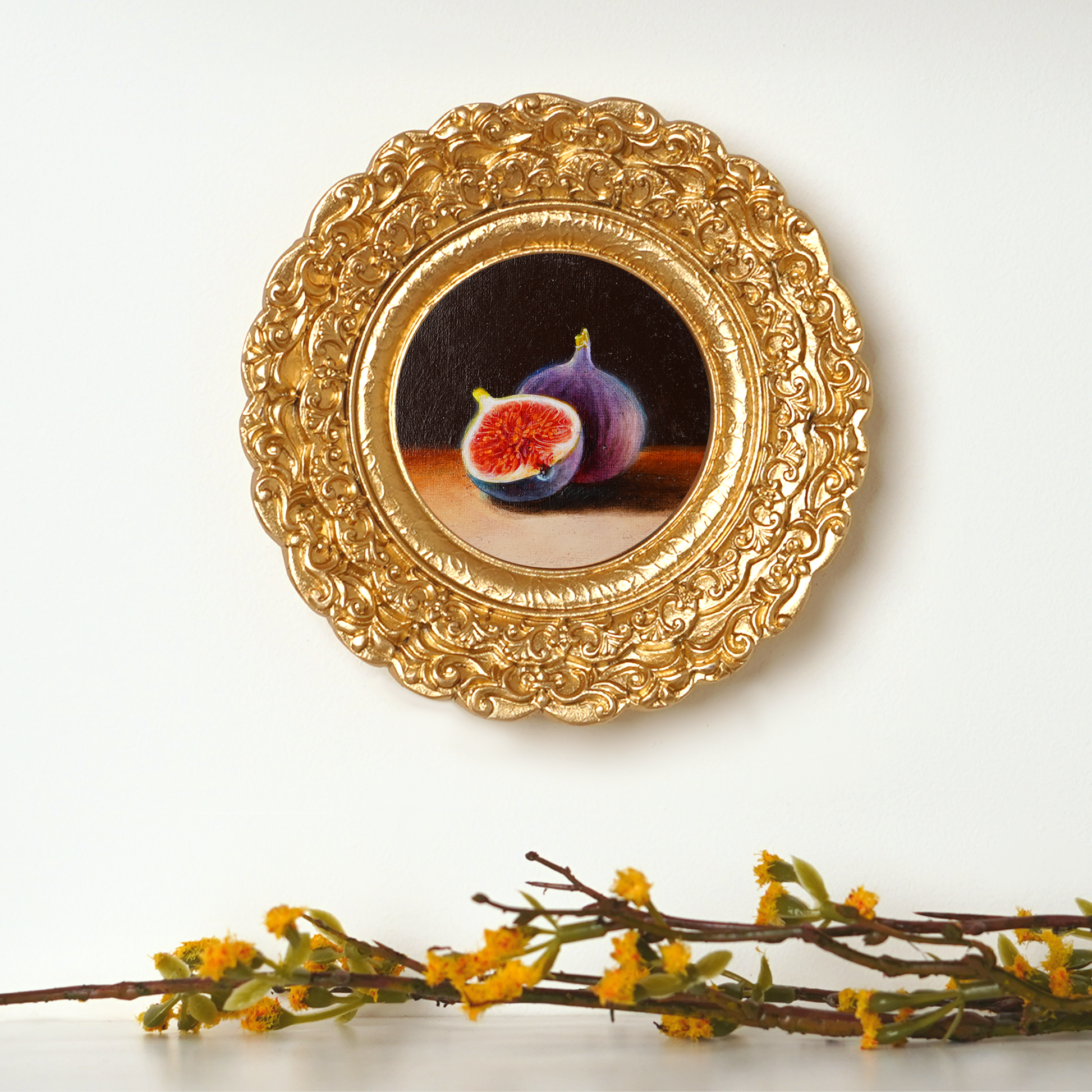 Hand-painted in oil on primed cardboard, this classic miniature still life captures the natural beauty and play of color, light, and form. Rich texture and visible brushwork are sealed with a glossy varnish for lasting vibrancy, making it a thoughtful gift and a charming accent for kitchen or dining room decor.