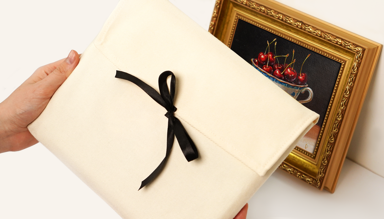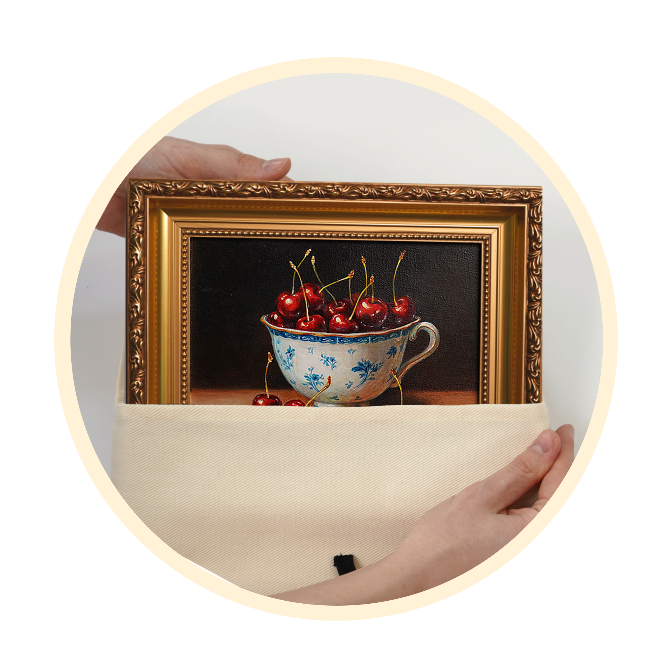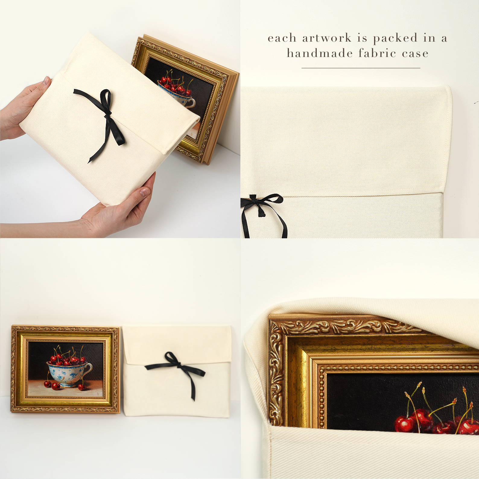Whether framed or unframed, your artwork will be carefully wrapped in a handmade cotton pouch/case (see photos!) and securely packaged for safe delivery.