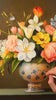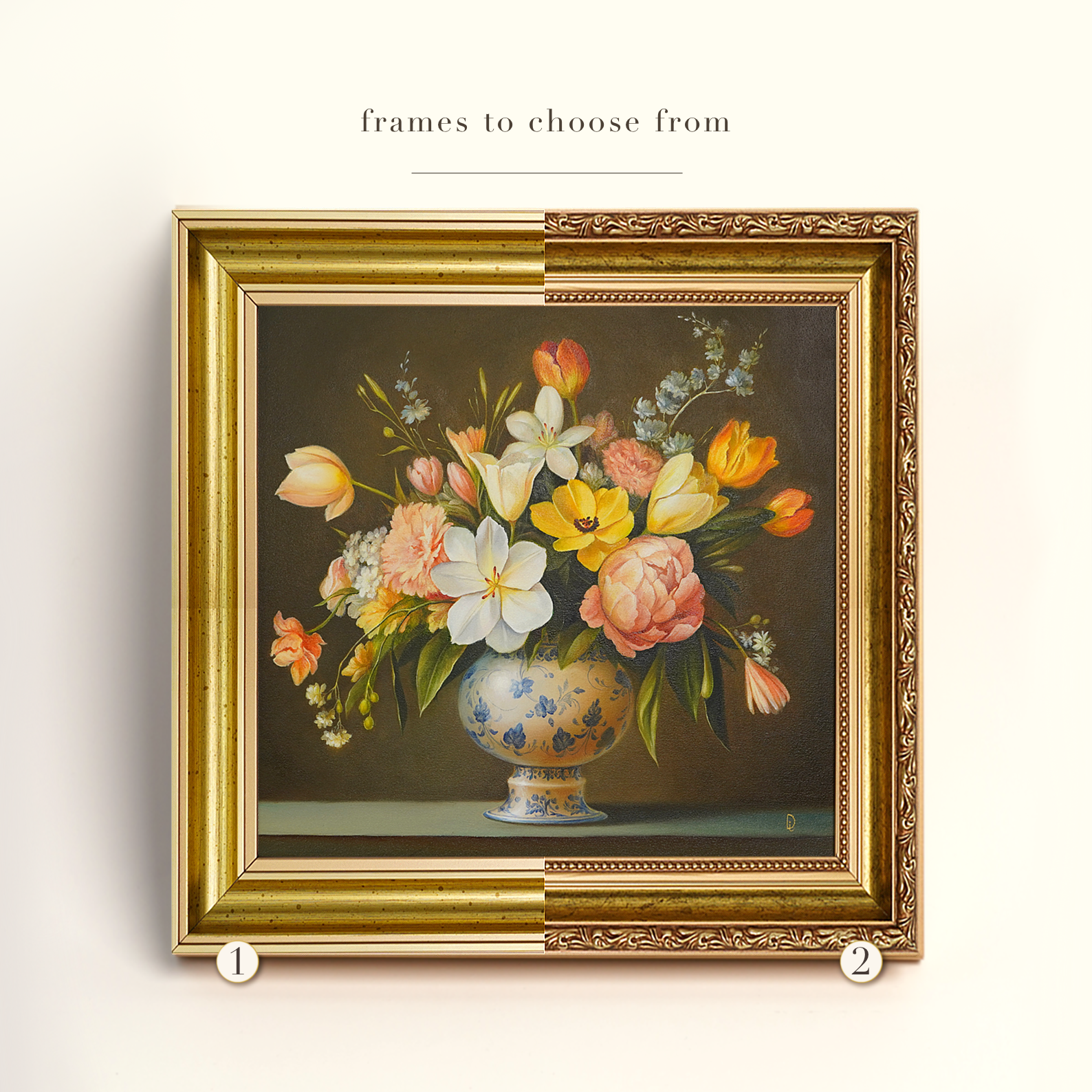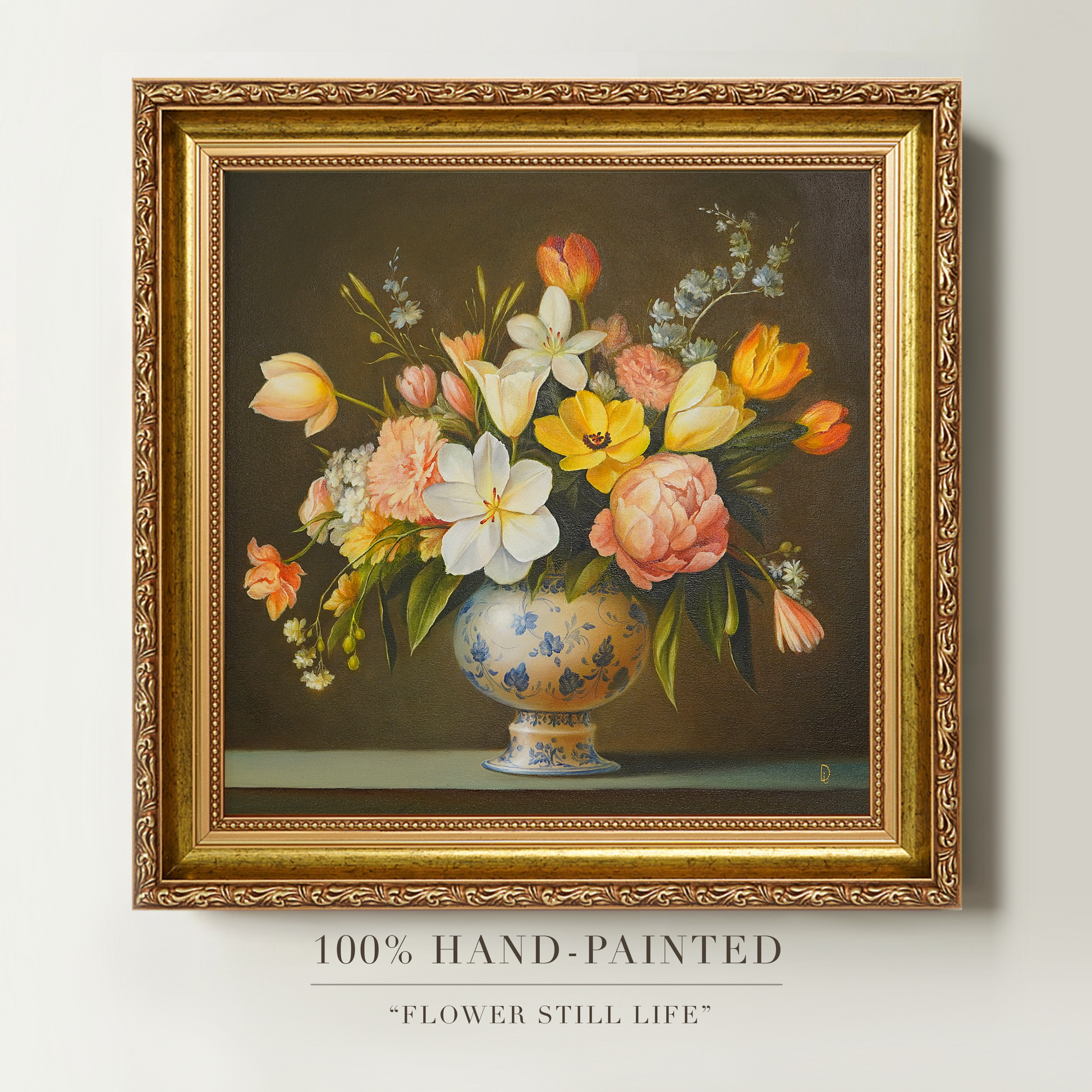 Hand-painted with oil on fine-grained stretched canvas, this floral still life is inspired by nature’s beauty. Visible brushwork and rich texture are sealed with a glossy varnish for lasting vibrancy, making each piece a truly one-of-a-kind and timeless gift.