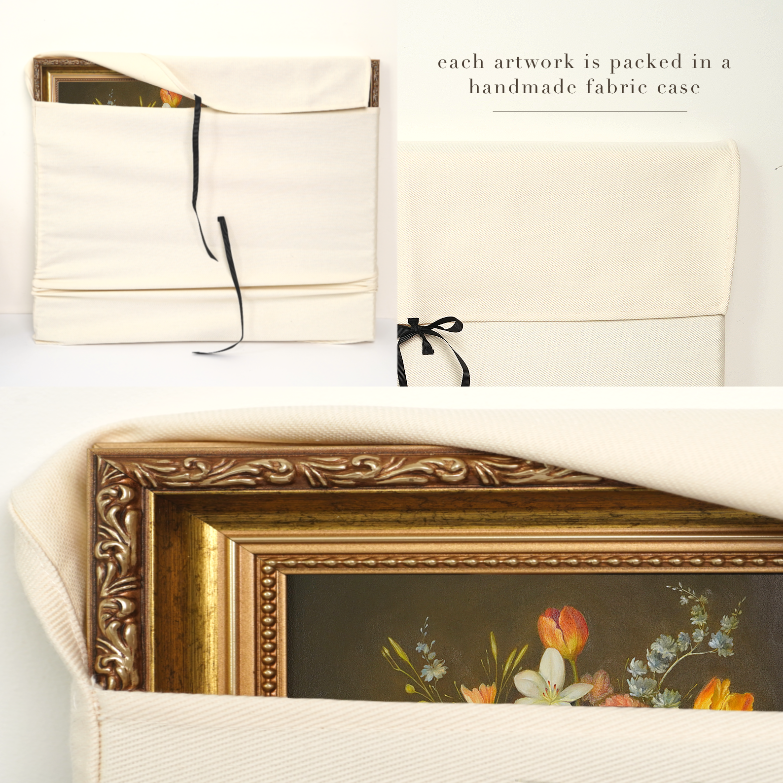 Whether framed or unframed, your artwork will be carefully wrapped in a handmade cotton pouch/case (see photos!) and securely packaged for safe delivery.