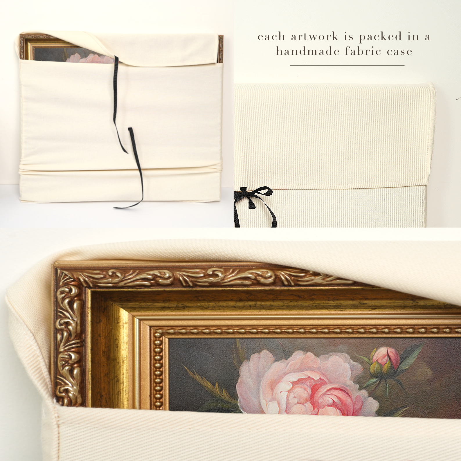 Whether framed or unframed, your artwork will be carefully wrapped in a handmade cotton pouch/case (see photos!) and securely packaged for safe delivery.