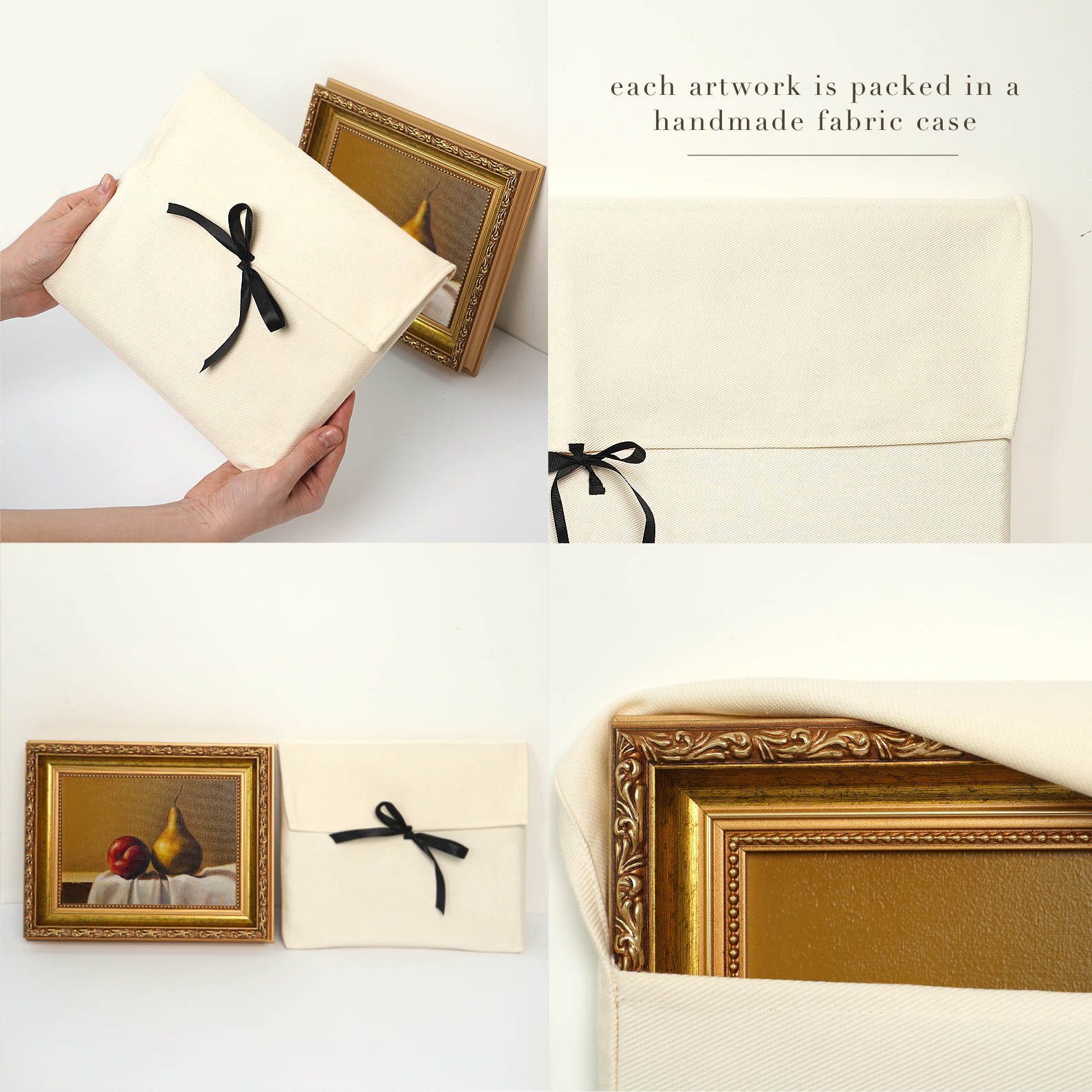 Whether framed or unframed, your artwork will be carefully wrapped in a handmade cotton pouch/case (see photos!) and securely packaged for safe delivery.