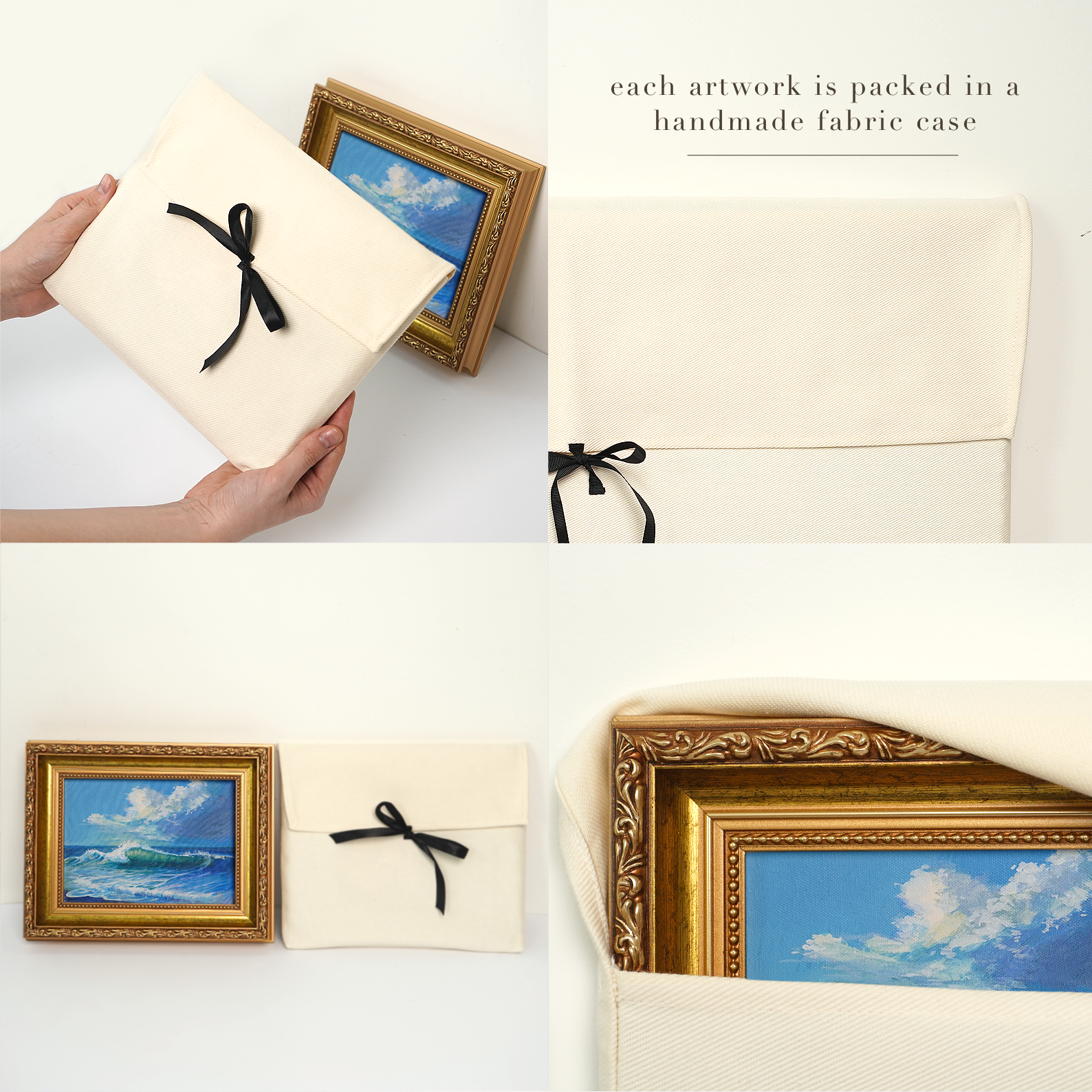 Whether framed or unframed, your artwork will be carefully wrapped in a handmade cotton pouch/case (see photos!) and securely packaged for safe delivery.